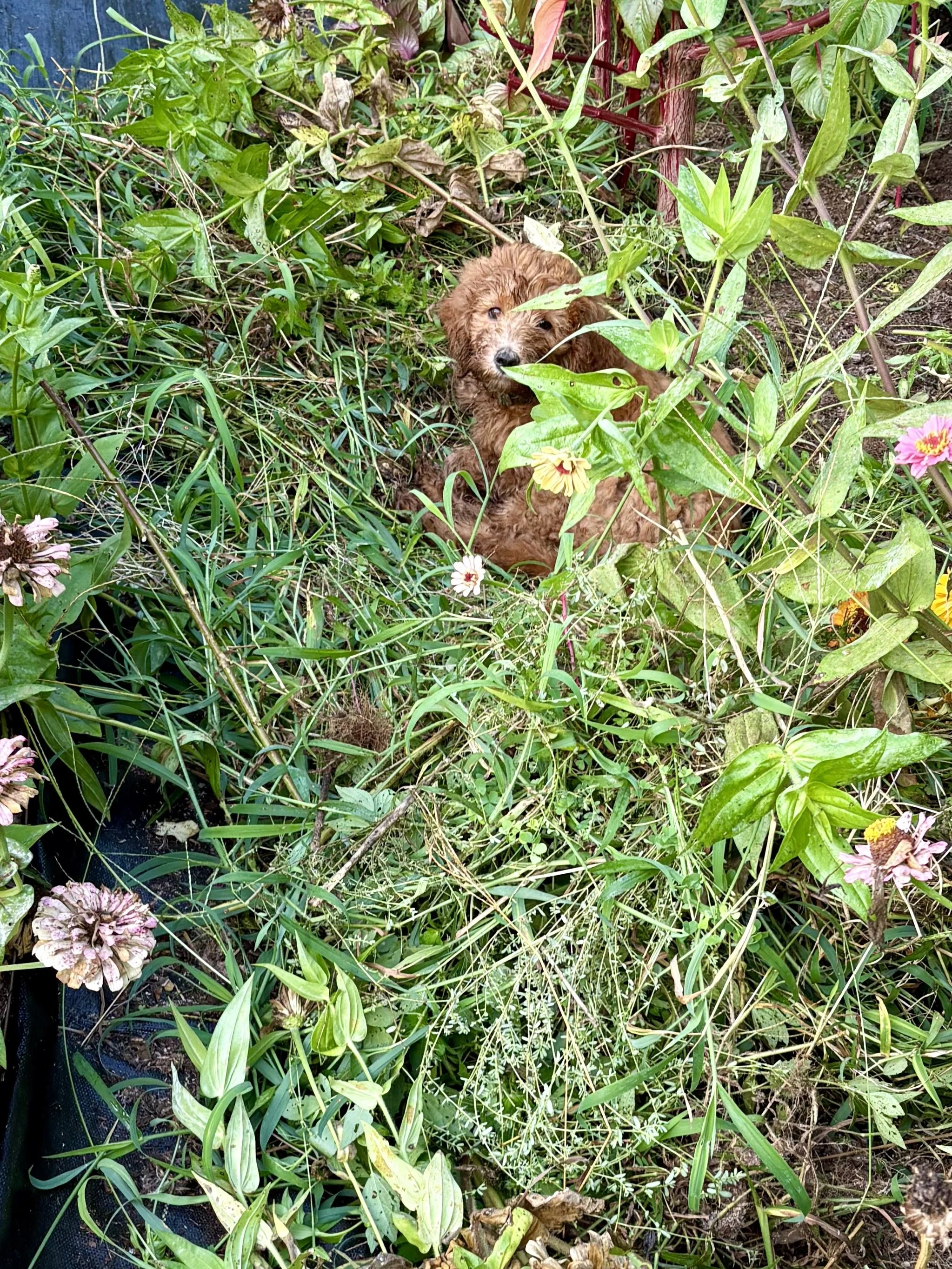 Delphi resting in a pile of overgrown zinnias and weeds at Hilltop